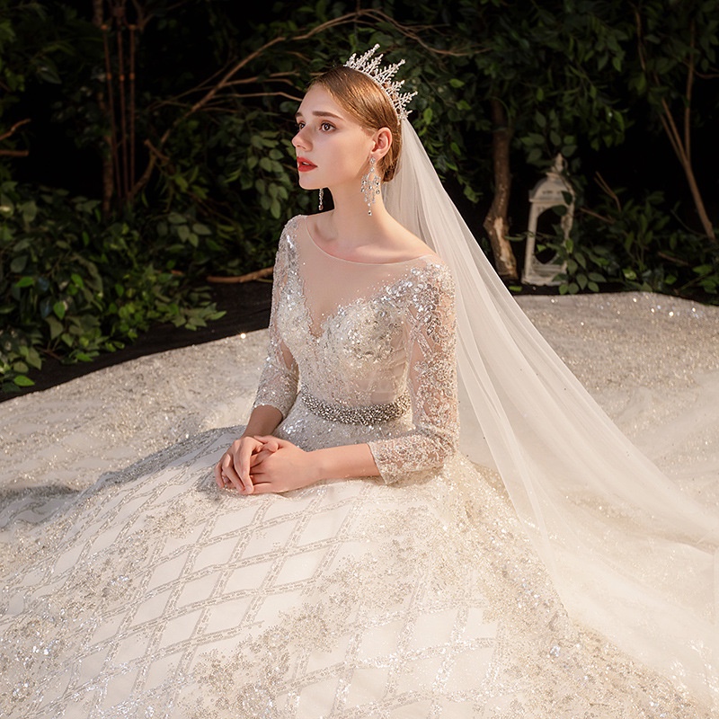 Jual Wanita Glitter Bling Lengan Panjang Gaun Pengantin Gaun Sabuk Berlian Termas 1m Tail Wedding Dress Indonesia Shopee Indonesia